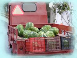 WATER MELON ON THE WAY TO THE SHOPSMost restaurants and kafeneions will offer chunks free after your meal or with a drink, at this time of year. You will see mountains of them on the roadside being offered for sale direct from the producers, or heaped on trucks struggling to cope with the weight as they carry them to markets and shops.